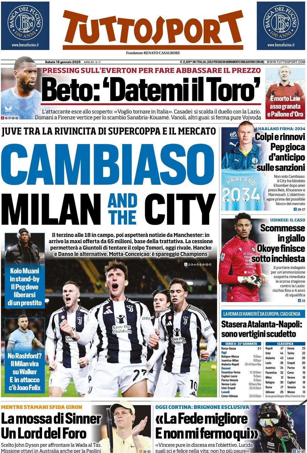 L'arrière joue à 18h00, puis il attendra des nouvelles de Manchester. Méga offre de 65 millions entrante. Une vente permettrait à Giuntoli de tenter le coup de Tomori, aujourd'hui rival. Hancko et Danso les alternatives. Motta-Conceiçao : barrage de Ligue des Champions.