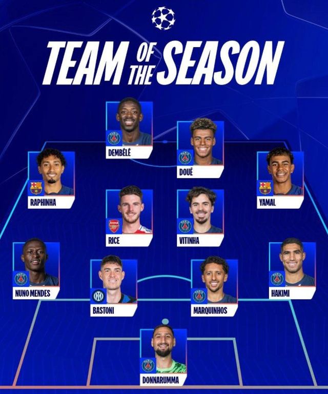 Donnarumma (PSG) – Hakimi (PSG), Marquinhos (PSG), Bastoni (Inter), Nuno Mendes (PSG) – Yamal (Barça), Vitinha (PSG), Rice (Arsenal), Raphinha (Barça) – Doué (PSG), Dembélé (PSG)