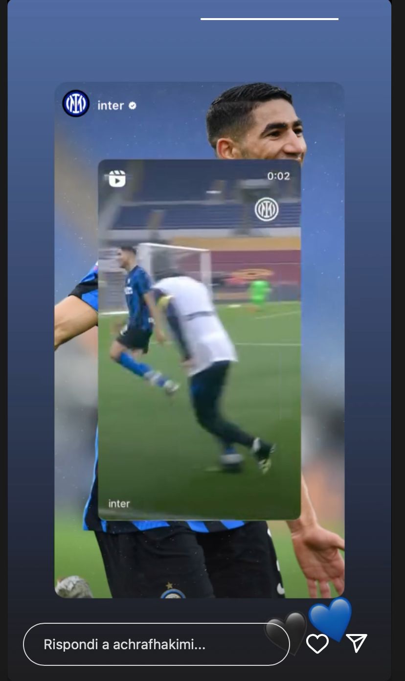 L'international marocain a publié une histoire Instagram contenant une image initialement publiée par le profil officiel de l'Inter avant le prochain match à l'extérieur des Nerazzurri contre les Giallorossi, qui montre Hakimi trouvant le chemin des filets au Stadio Olimpico lors de la saison 2020-2021, lorsqu'ils remportent le Scudetto sous Antonio Conté.