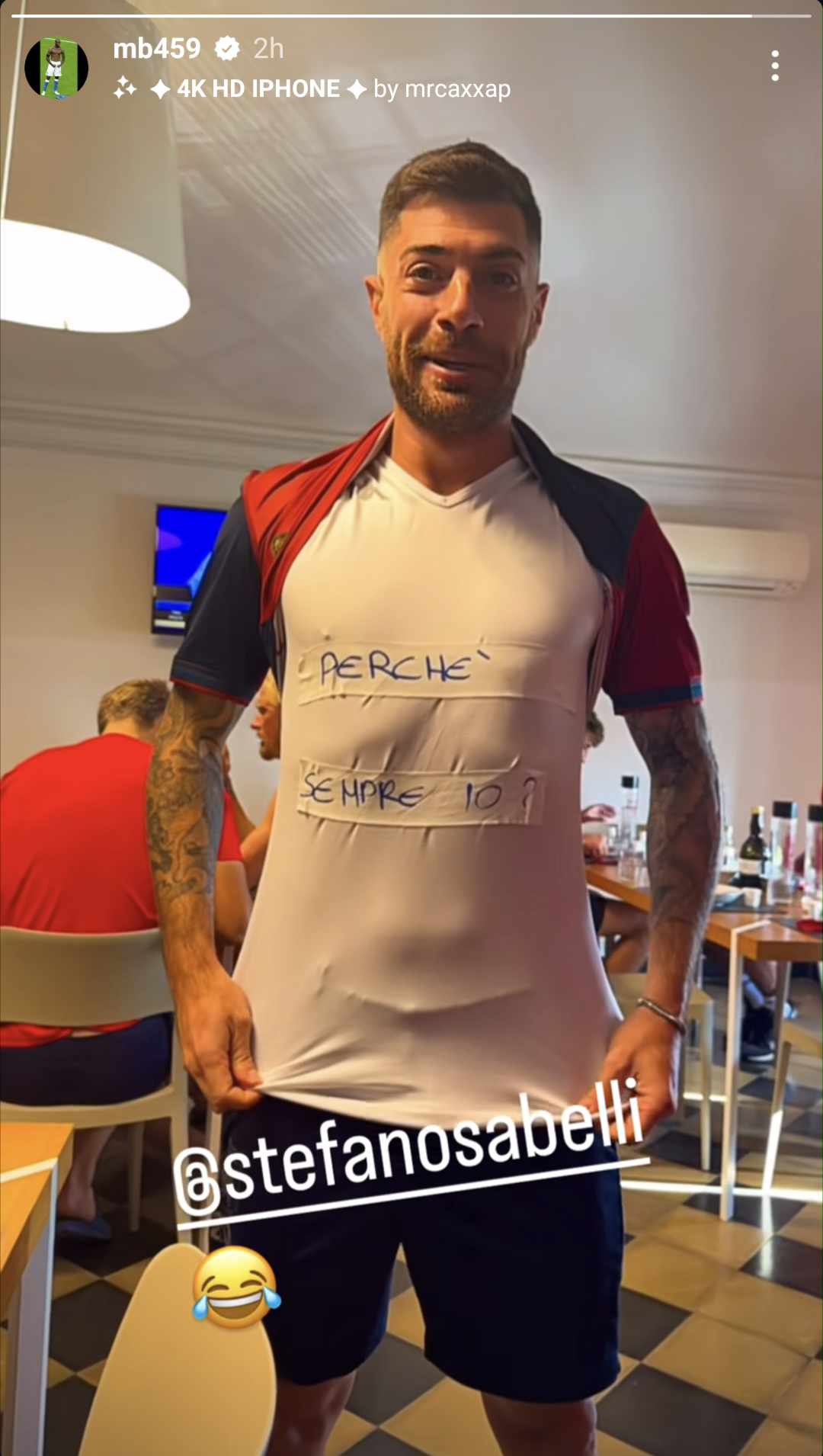 Balotelli a publié mercredi matin une vidéo sur son histoire Instagram depuis la cantine du terrain d'entraînement de Gênes, montrant Sabelli dans un t-shirt avec la traduction italienne de “pourquoi toujours moi” écrite dessus.