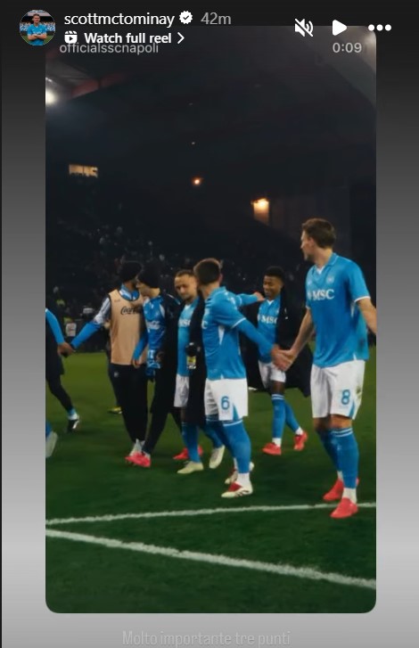 McTominay a célébré la victoire de Naples sur Instagram, partageant une vidéo de Naples dans une story.