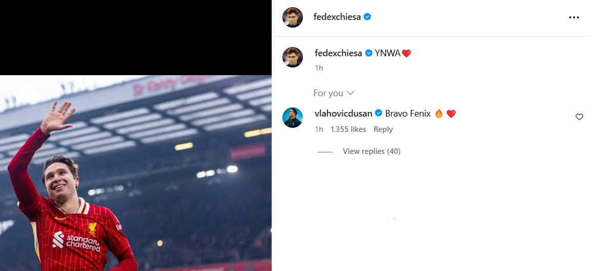 Federico Chiesa a écrit le slogan de Liverpool « YNWA » sur Instagram après avoir marqué son premier but pour les Reds et a été complimenté par son ancien coéquipier Dusan Vlahovic « Bravo Fenix ».